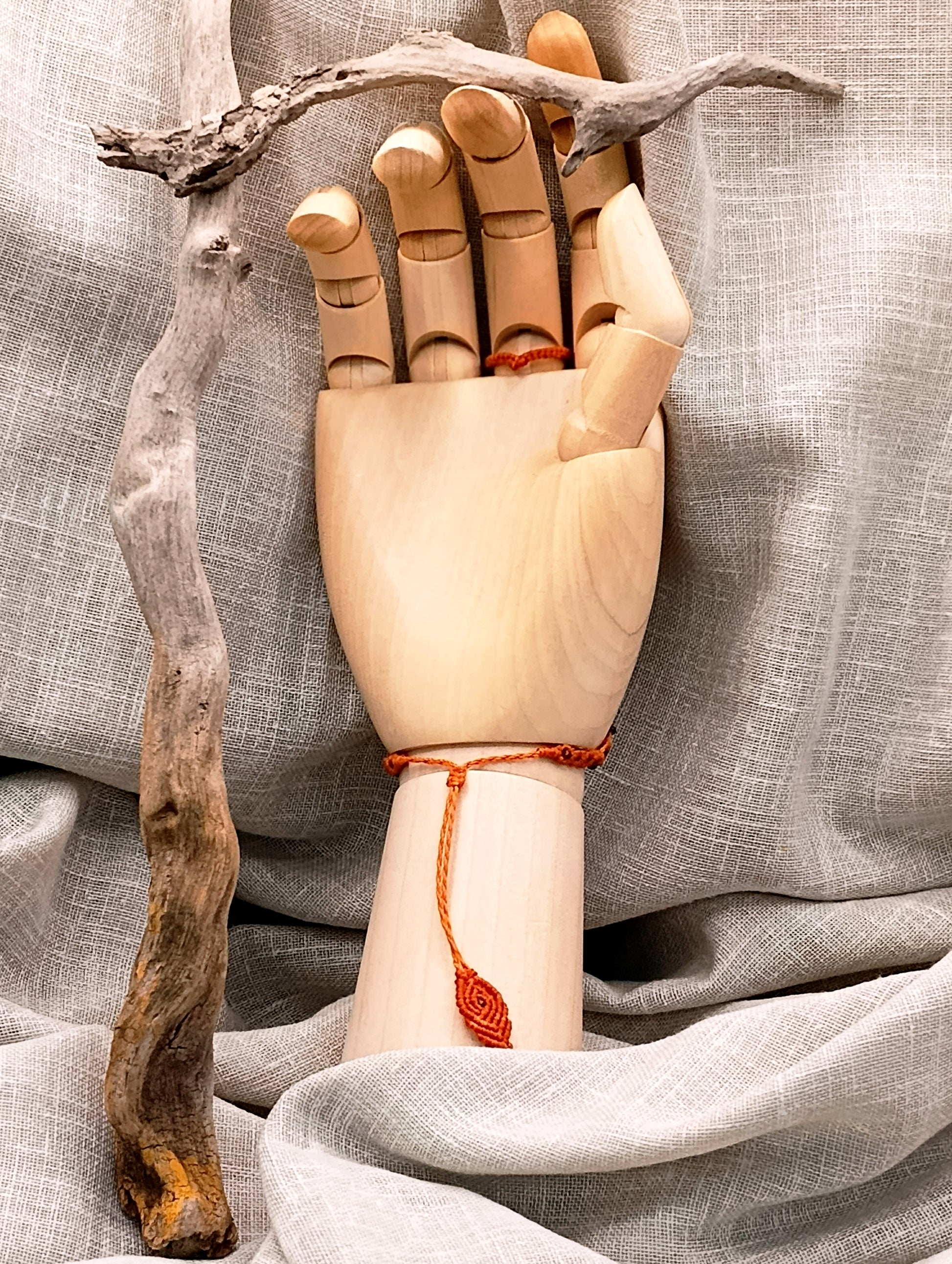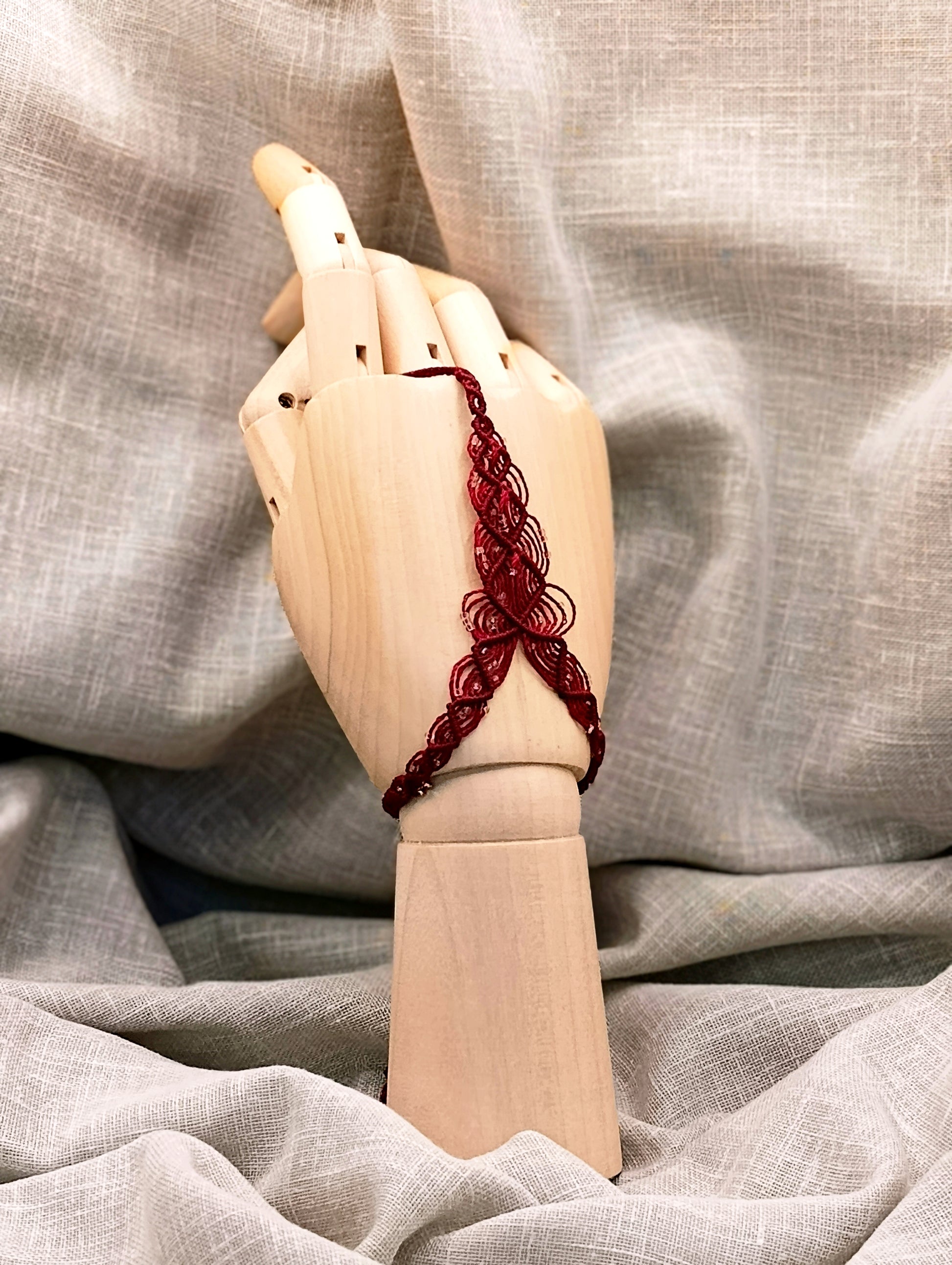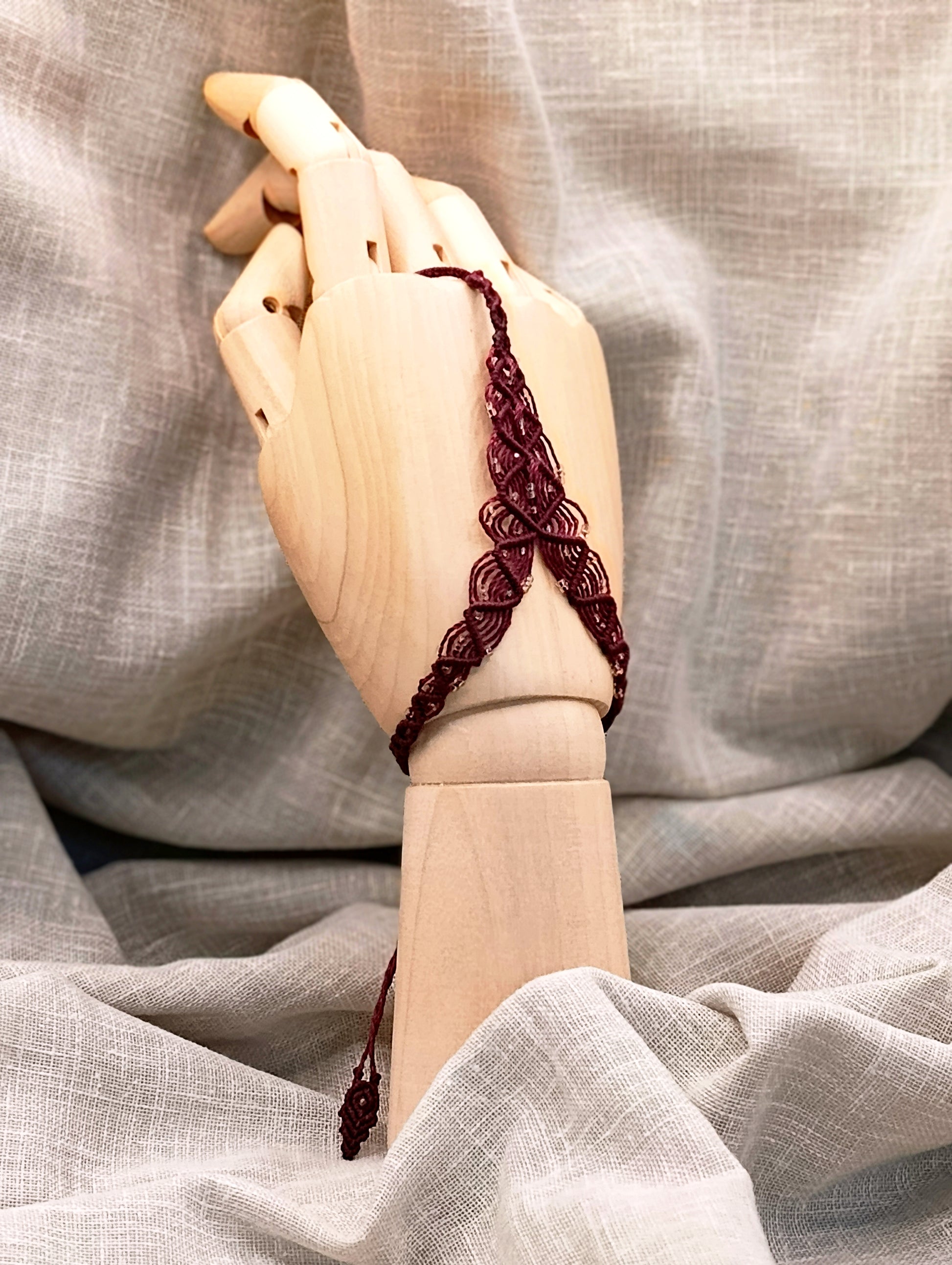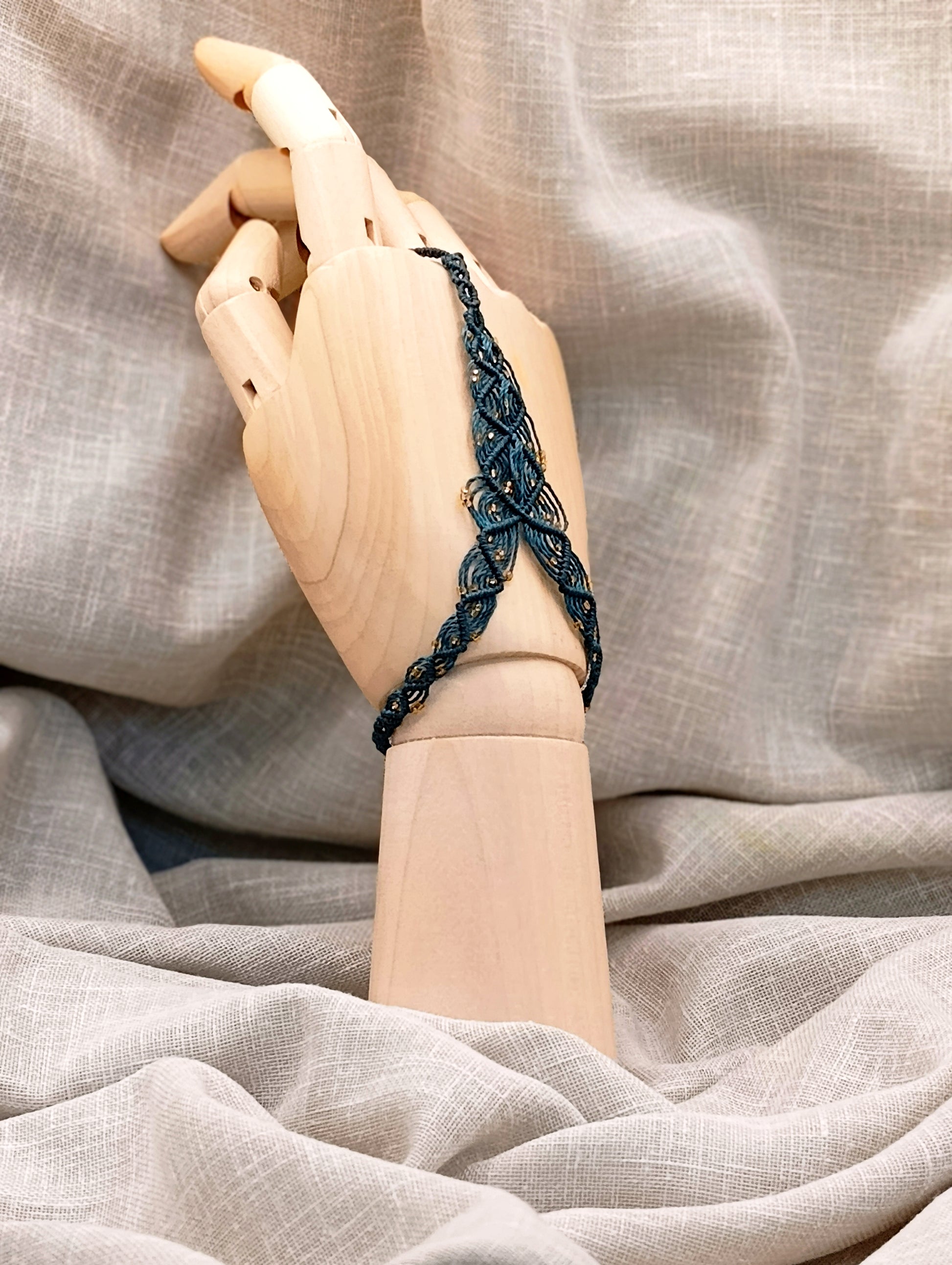 Le Gantelet Délicatesse est un bracelet-bague réglable qui se porte sur le dos de la main, ancré au majeur et au poignet. Son motif ornemental de vagues tissées en micro-macramé, et orné de perles de rocaille, souligne tout en finesse la beauté de votre main.